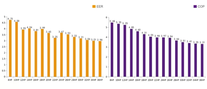 The cooling EER is up to 4.75 and the heating COP is up to 5.48 in the 8HP category.