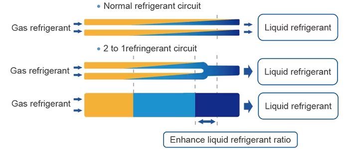 Optimized 2 to 1 refrigerant circuit design,increase the heat exchanging efficiency and enhance the ratio of liquid which flow to the evaporator.