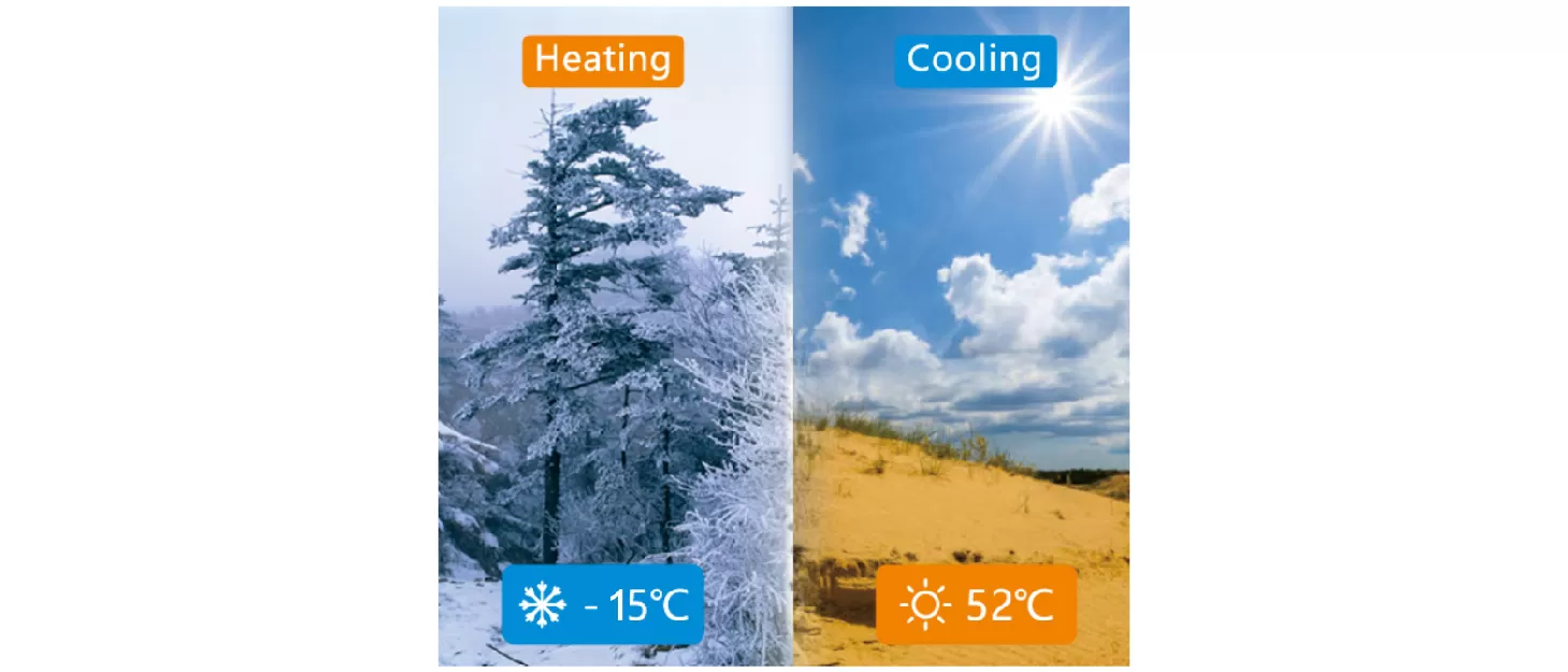 The outdoor unit can operate smoothly in both scorching summer with a temperature as high as 52℃ and freezing winter with a temperature as low as -25℃, making you feel like spring all year round.